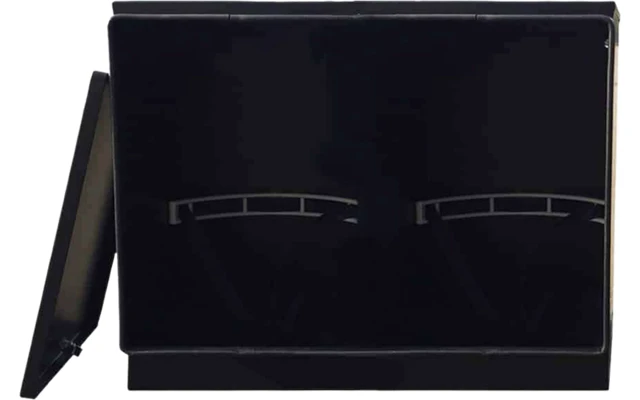 Die Box ist aus Stahl gefertigt und pulverbeschichtet, der Zugang erfolgt über eine komplett abnehmbare Frontplatte, die von zwei Vierteldrehverschlüssen gehalten wird. Eine Gummidichtung und eine 50 mm hohe Bodenwanne sorgen für die Sicherheit Ihres Gasspeichers.