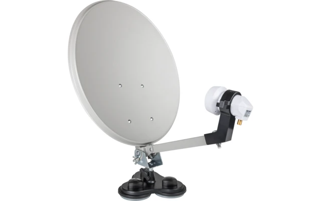 Lieferumfang: Transportkoffer (Kunststoff), 41 x 38 cm Spiegel (Stahl), Saugfuß, Mast- und Wandhalterung, Kompass, Montagezubehör, Aufbauanleitung, Single LNB, 10 m Koaxialkabel, 2x F-Stecker, 1x Gummitülle