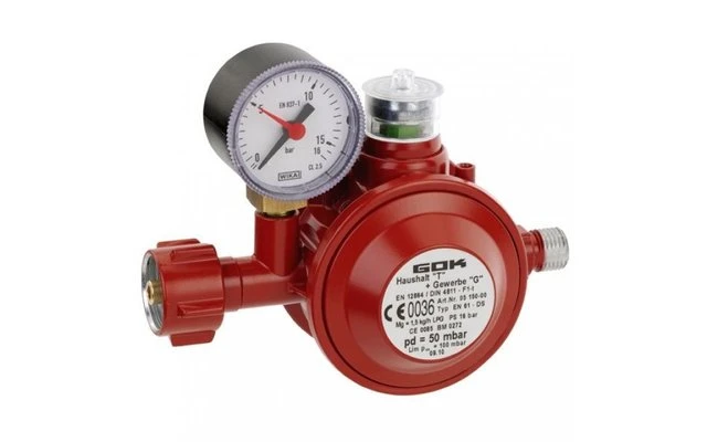 Thermische Absperreinrichtung und Kontrollmanometer. Zusätzlich mit integrierter Sichtanzeige. Einzusetzen für Haushaltsinnenanlagen (z.B. auch fahrbare Heizgeräte) und für alle Kleinflaschenanlagen im gewerblichen Bereich.
