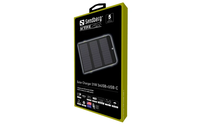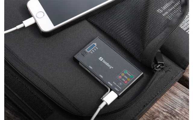 Sandberg Solar Charger 21W 2xUSB+USB-C ist eine Kombination einer leistungsstarken 10000 mAh PowerBank und eines faltbaren Solarpanels zum schnellen, effizienten Wiederaufladen im Sonnenlicht. Hängen Sie es beispielsweise beim Wandern über Ihren Rucksack. So können Sie immer sicher sein, dass Sie Strom für Ihre Mobilgeräte haben, egal wie weit die nächste Netzsteckdose entfernt ist. Wasser- und stoßfestes Material. Laden Sie Ihre Geräte mit den drei USB-Ports.