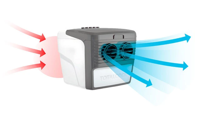 Das Gerät ist aus bakterienresistentem Kunststoff für den robusten Einsatz hergestellt und unter Berücksichtigung der Umweltschutzfaktoren mit einem biologisch abbaubaren Filterelement ausgestattet. Der TotalCool produziert im Betrieb mit Leitungswasser einen um bis zu 45% abgekühlten Luftstrom und kann in nahezu jeder Umgebung mit der Möglichkeit der Frischluftzufuhr eingesetzt werden.